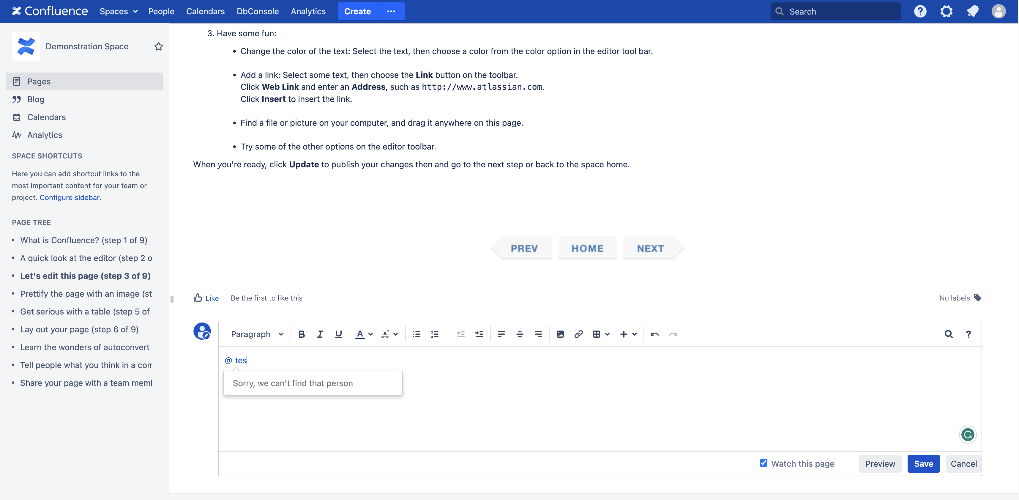 If you are a person who doesn’t have permission to mention the people who have at least View Space permission on this space, you could not search for the users by using the “@“ sign or using the user macros