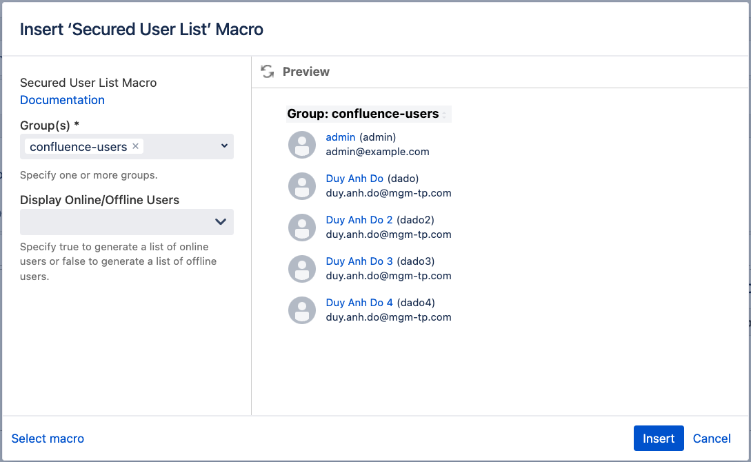 We developed a macro named Secured User List Macro to replace inbox User List Macro because of security leaks. This macro is installed by default when you install the plugin.