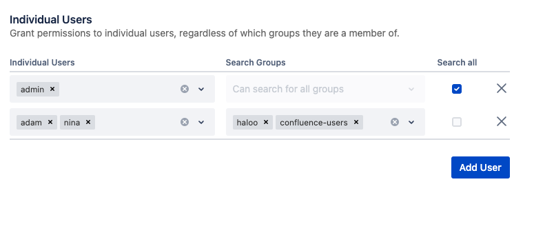 By selecting the 'Search All' checkbox, both groups and individual users can be configured to have the ability to search for all users in Confluence.