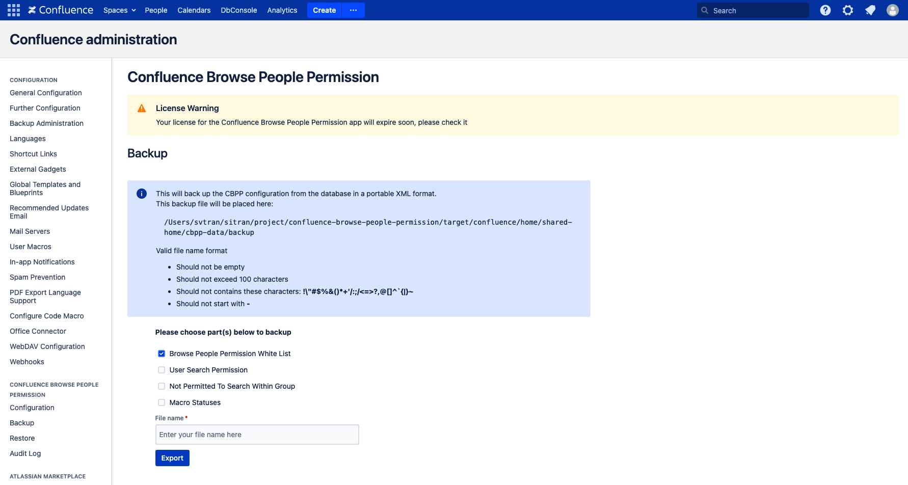 Under the section Browser People Permission for Confluence, select Backup
