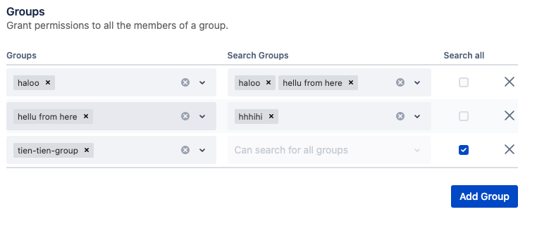 1. if you want to grant permission to search all groups in Confluence, simply check the checkbox in the Search All column