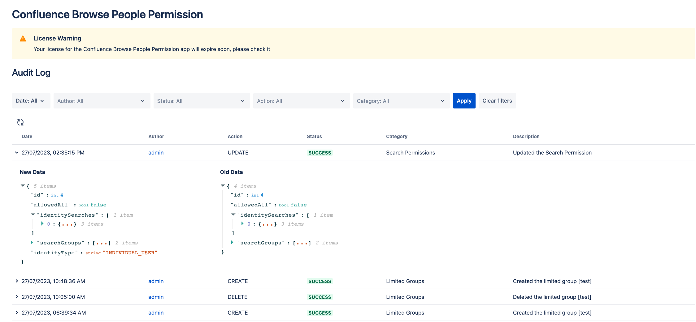Audit logs can include many historical entries but you can use the filters to narrow them down. You can filter either by date range, status (the result of executing an action), author (who executes the action) or category.