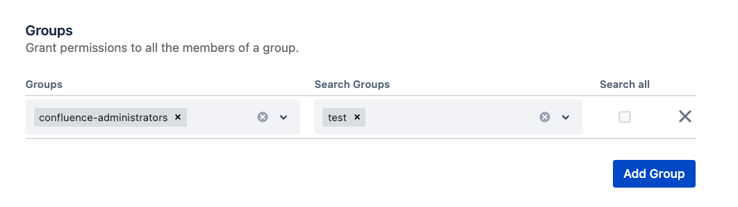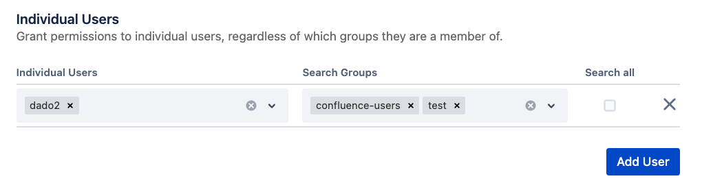 By selecting the 'Search All' checkbox, both groups and individual users can be configured to have the ability to search for all users in Confluence.